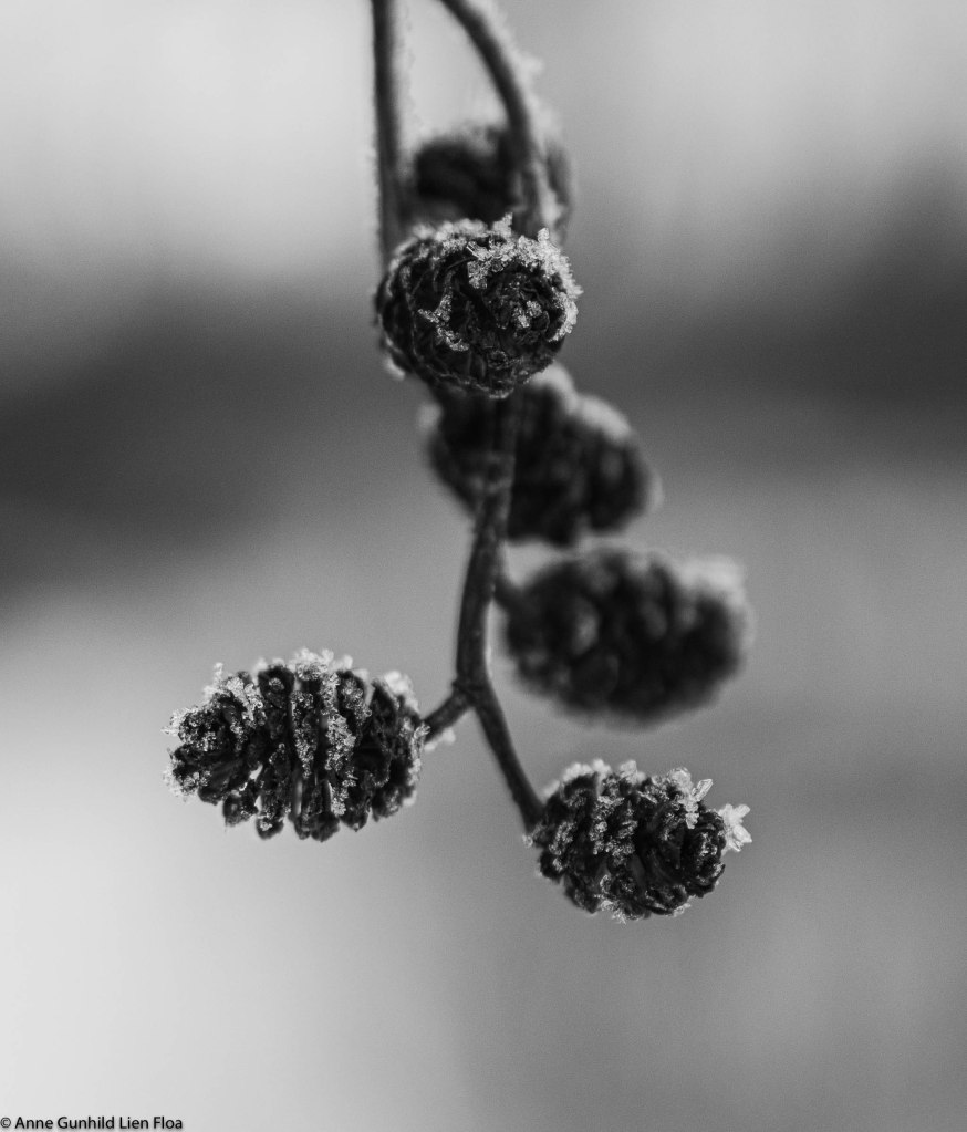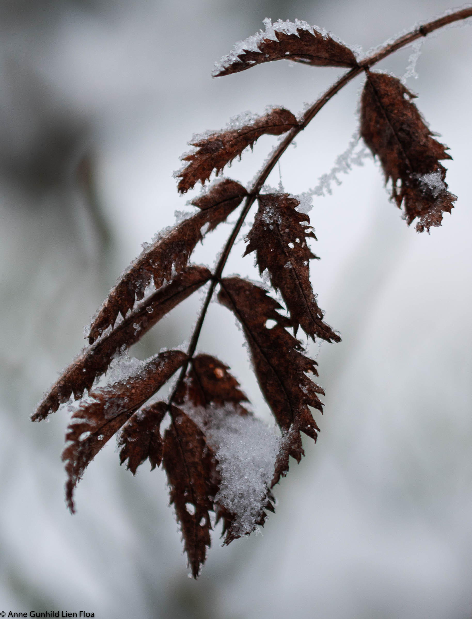 Doing macro photography can be difficult this time of the year, as it is dependent of a sufficient amount of light. Photographing leaves is fun as they comes in so many shapes. During winter they turn grey or black, but some times you can find some that have some colors left. Like this rowan (in the photo below), it still has some deep brown color. The landscape behind is all in shades of grey and the brown leaf stand a little bit out due to the frosty edges. Winter may be colorless but it is beautiful in many ways.